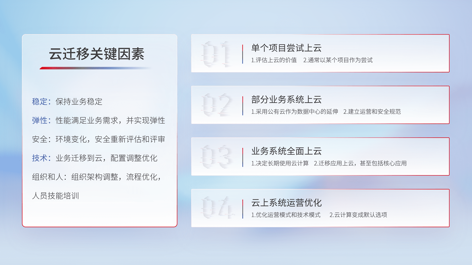 结合实际业务,,从规划设计、、、、云平台选型、、、云原生改造、、数据迁移、、、集成交付,,迁移全过程为客户识别最佳上云路径,,做好风险识别管理,,,,设计网络架构、、、身份权限、、、、安全审计合规、、、、操作审计、、、日志审计、、、、监控告警策略、、、、多站点容灾设计等,,对云上基础设施进行整体规划,,,,提升IT治理水平,,,,以满足弹性、、、、高可用、、高性能的需求。。