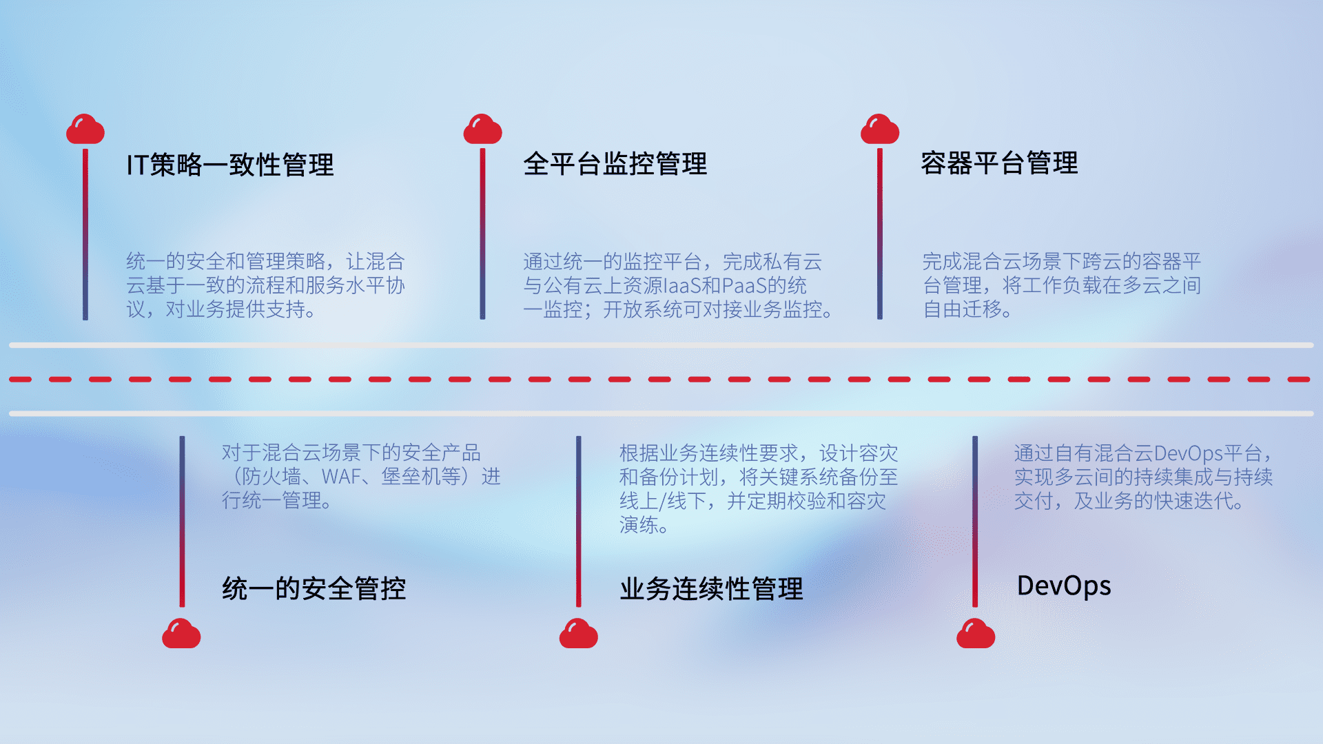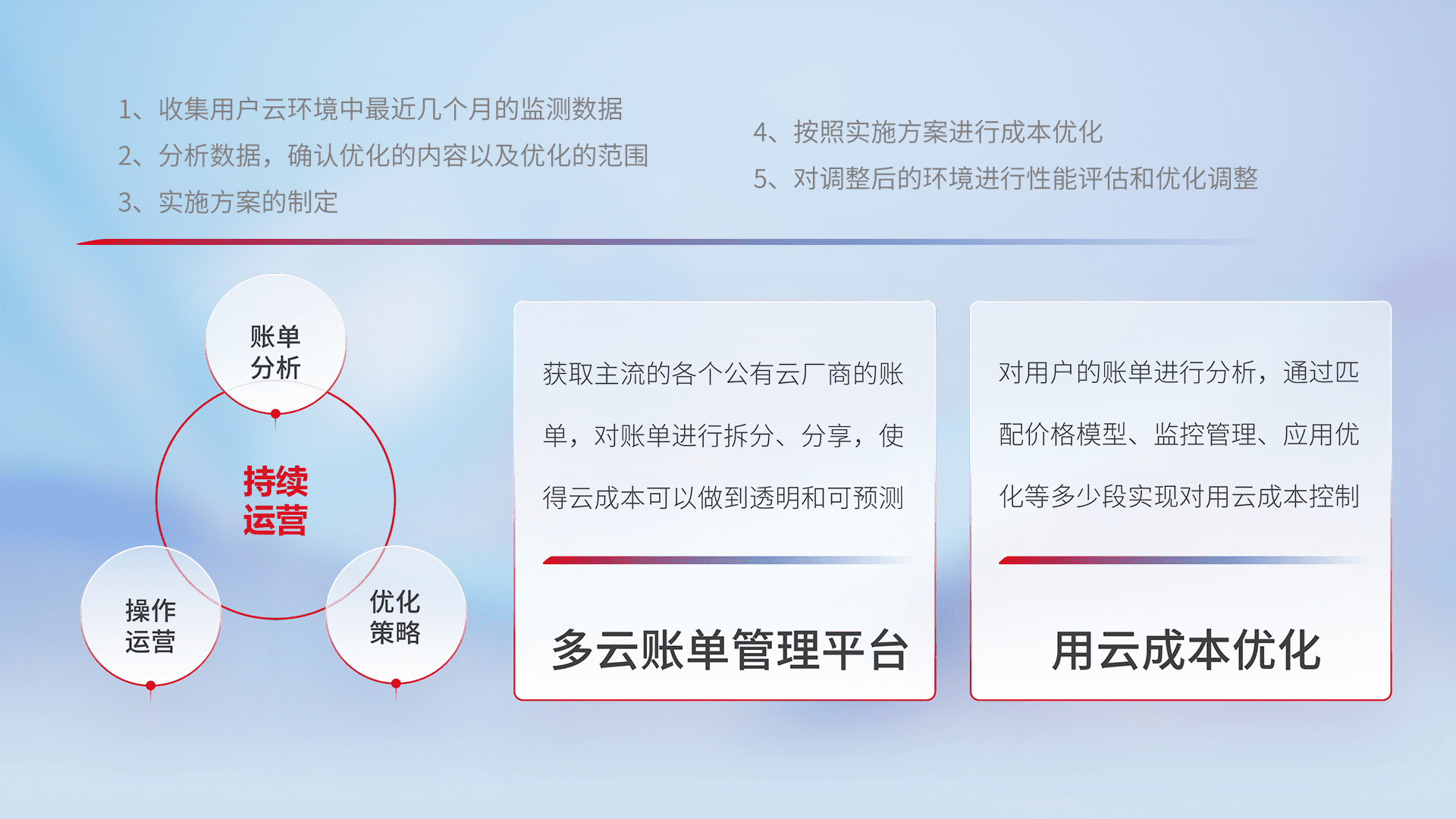通过多云纳管,,,以统一的资源数据模型把客户的云资源进行抽象和封装,,进而实现对多云资源的统一操作,,,保障云资源管理的可靠性、、稳定性与可用性。。。量身定制化运维内容,,配置、、、开发运维、、、、补丁管理、、、、备份、、、监控、、、、认证和访问管理、、审计和日常巡检等,,,,保障在用云过程中的可靠度,,,稳定度以及高可用率。。。。