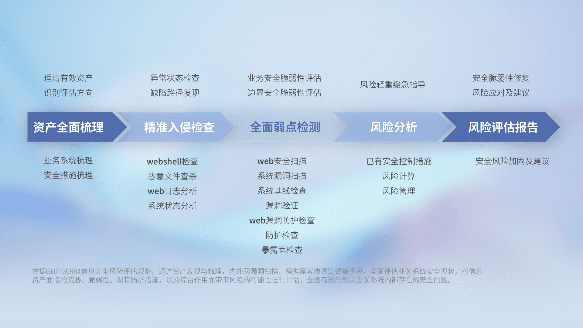 针对客户行业特性,,以专业的安全服务+多厂商联合解决方案提供专属的一站式安全管理服务,,帮助客户全面感知网络空间威胁,,,基于识别、、、检测、、、、分析、、防护、、、、监测、、响应的服务理论模型,,从方案咨询、、、集成交付、、、评估验证、、、优化加固、、、运维运营,,致力于为客户提供完整的闭环管理式安全服务。。。以实战经验为客户打造高抵御风险的安全体系,,,帮助客户发现威胁、、对抗威胁、、处置威胁,,,不断积累安全对抗能力,,,持续保障数字化安全。。。